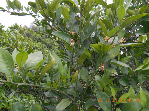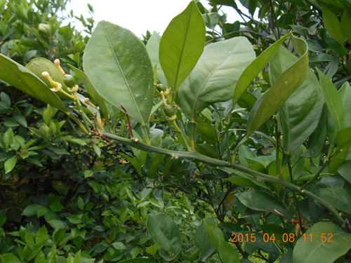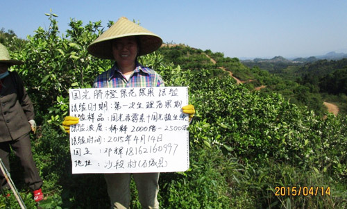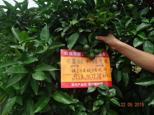 2015年4月,江西省贛州市石城縣沙段村,在臍橙謝花2/3和第二次生理落果期使用兩次“國光植生源2000-2500倍+赤霉酸2000-2500倍+氨基酸水溶肥1000倍”葉面噴施,使用后的臍橙葉片深綠,光澤度好,坐果率高,果型均勻,保果效果明顯。