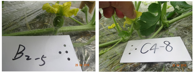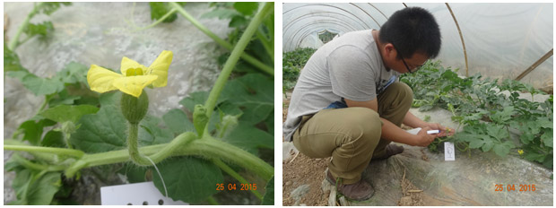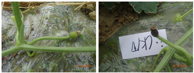 7、使用調(diào)節(jié)劑。在雌花開放當(dāng)天或前一天,使用0.1%氯吡脲噴瓜胎,噴施時(shí)要均勻,噴正反兩面。一般在溫度低于18度使用0.1%氯吡脲10ml兌水1.5kg左右噴瓜胎,溫度在18-24度使用0.1%氯吡脲10ml兌水1.5-2kg,溫度25-30度使用0.1%氯吡脲10ml兌水1.5-3kg噴瓜胎可促進(jìn)座瓜,提高座瓜率。