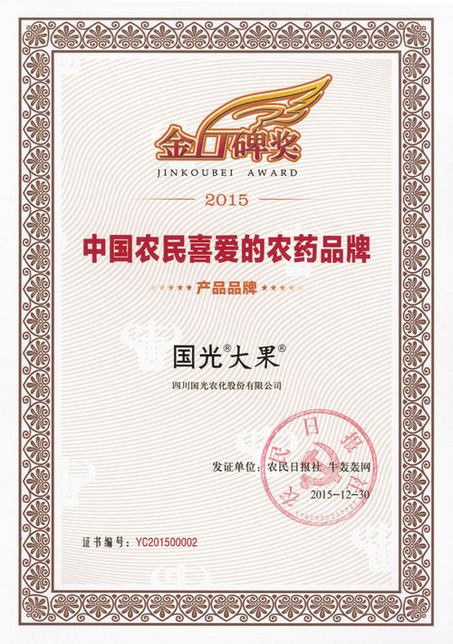 “2015中國農(nóng)民喜愛的農(nóng)藥品牌”大型公益調(diào)查活動在2015年10月22日啟動,通過農(nóng)民日報等機(jī)構(gòu)調(diào)查,國光“大果”榮獲2015中國農(nóng)民喜愛的農(nóng)藥品牌稱號。
