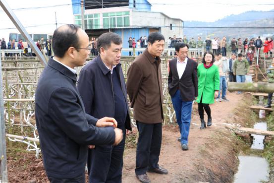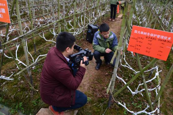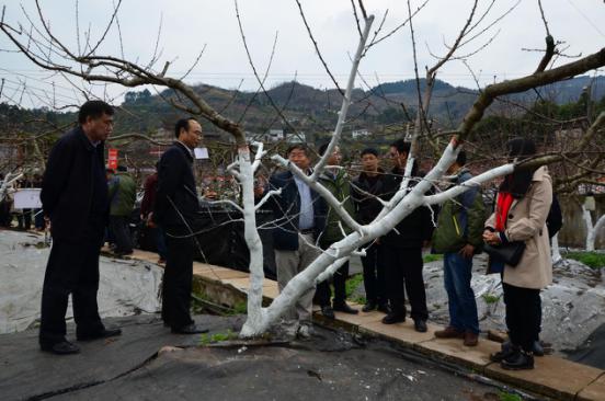 專家領(lǐng)導們在國光“冬保護”桃樹基地觀摩