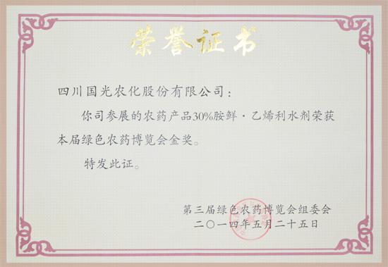 2014年5月25日,由中國(guó)農(nóng)藥發(fā)展與應(yīng)用協(xié)會(huì)主辦的第三屆綠色農(nóng)藥博覽會(huì)在山東濰坊舉辦。依據(jù)《中國(guó)綠色農(nóng)藥博覽會(huì)參展農(nóng)藥評(píng)選辦法》,經(jīng)過(guò)第三屆綠色農(nóng)藥博覽會(huì)組委會(huì)認(rèn)真評(píng)選,“國(guó)光30%胺鮮·乙烯利水劑”榮獲第三屆綠色農(nóng)藥博覽會(huì)金獎(jiǎng)。這也是繼“國(guó)光0.1%三十烷醇微乳劑”獲得第一屆綠色農(nóng)藥博覽會(huì)金獎(jiǎng)后再次榮獲金獎(jiǎng)。