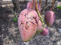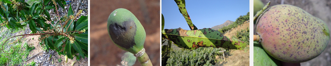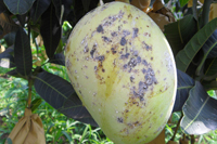 發(fā)病規(guī)律:病原為半知菌亞門擬莖點(diǎn)(Phomopsis mangiferae)和色二孢霉(Diplodia mangiferae)病菌均以菌絲體和子實(shí)體(分孢器)在病株和病殘?bào)w上存活。氣溫適宜時(shí),分孢器涌出大量分生孢子,借風(fēng)雨傳播,主要從傷口侵入致病。溫暖多濕有利于病菌繁殖傳播侵染,植株、果實(shí)病、蟲傷口多樹勢哀落的果實(shí)發(fā)病較重。