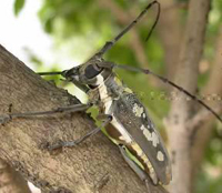防治方法: 防治脊胸天牛主要有捕殺成蟲、清除卵塊和消滅幼蟲3個(gè)環(huán)節(jié)。1、每年4~5月是成蟲大量羽化及飛出交尾、產(chǎn)卵的時(shí)間,應(yīng)加緊巡園觀察,發(fā)現(xiàn)成蟲遷飛時(shí)可用捕蟲網(wǎng)加以捕殺。2、天牛產(chǎn)卵在枝梢上時(shí)往往先咬破嫩梢上的樹皮,然后將卵粒產(chǎn)在其中,且卵粒較大,容易被發(fā)現(xiàn)。發(fā)現(xiàn)卵粒時(shí)要立即將其摘除銷毀,以減少幼蟲孵化鉆蛀危害的機(jī)會。3、發(fā)現(xiàn)天牛蛀道的孔洞,可用鐵線穿刺孔道鉤殺幼蟲,也可用56%磷化鋁片劑,或以毒死蜱等藥液堵塞蛀道孔內(nèi),然后用泥團(tuán)(或棉簽)封閉洞口,將幼蟲毒殺于蛀道內(nèi)。