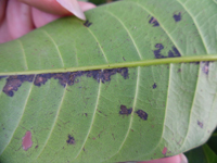 癥狀:該病在嫩葉時(shí)即感染,首先從葉背開始,病斑圓形,暗褐色至黑色;在潮濕的條件下,病斑上可見絨毛狀物,后期病葉通常扭曲,畸形;老葉感病后常在葉背上有許多黑色的小凸起,中央有開裂的小斑,嚴(yán)重時(shí)可引起大量落葉;未成熟的果實(shí)感病后在果皮表面常見發(fā)生許多凸起的小黑斑,中熟的果實(shí)感病后在果皮表面常見發(fā)生許多凸起的小黑斑,中央呈星狀裂,病部后期產(chǎn)生大量微小黑點(diǎn)(瘡痂病在果實(shí)上發(fā)病最具代表性的特點(diǎn)是“火山口”病斑),這是該病原菌的分生孢子盤,潮濕時(shí)其上有稀疏的灰色霉?fàn)钗,病果易脫落?/span>