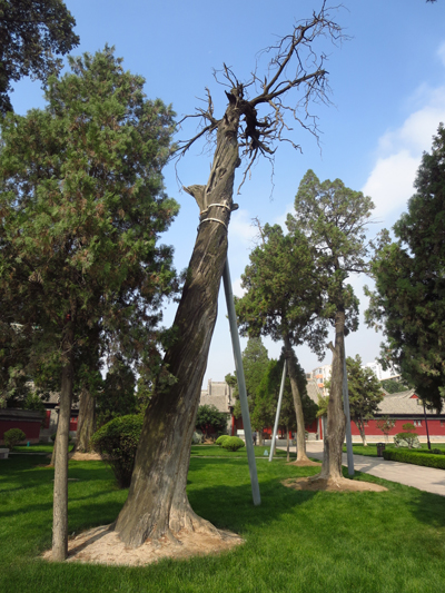 (3)人為的危害及其土壤理化性質(zhì)降低。伏羲廟里游人密集,地面踐踏頻繁。致使土壤板結(jié),通氣不良;有的樹干周圍鋪裝面積過大,僅留下很小的樹盤,影響了地上與地下氣體交換,使古樹處于透氣性極差的環(huán)境中。造成土壤理化性質(zhì)變壞,加速了古柏樹的衰老。